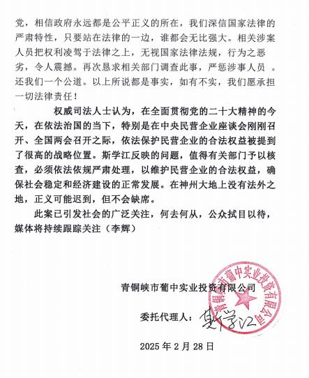 权威司法人士认为,在全面贯彻党的二十大精神的今天,在依法治国的当下,特别是在中央民营企业座谈会刚刚召开、全国两会召开之际,依法保护民营企业的合法权益被提到了很高的战略位置。斯学江反映的问题,值得有关部门予以核查,必须依法依规严肃处理,以维护民营企业的合法权益,确保社会稳定和经济建设的正常发展。在神州大地上没有法外之地,正义可能迟到,但不会缺席。