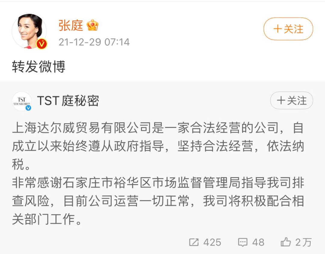对此,今日凌晨,TST庭秘密官微发布声明回应涉嫌传销被查处一事称,上海达尔威贸易有限公司是一家合法经营的公司。公司感谢河北石家庄政府指导排查风险,目前公司运营一切正常,将积极配合相关部门工作。