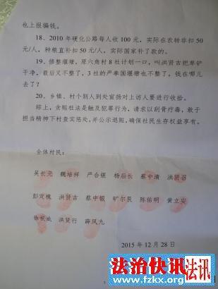 2015年12月28日吴长元等村民们列举了针对金峰镇大义村支书王平的20个问题进行了举报。但他没有得到任何处理。