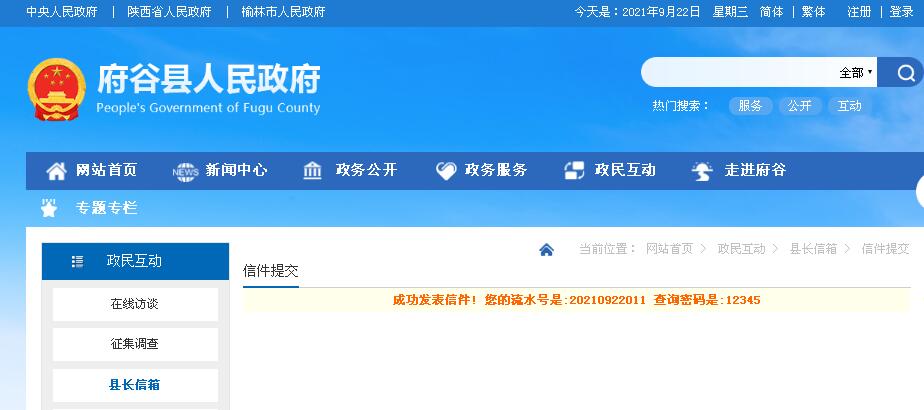 成功发表信件! 您的流水号是:20210922011 查询密码是:12345。我们静等府谷县官方对此的答复。