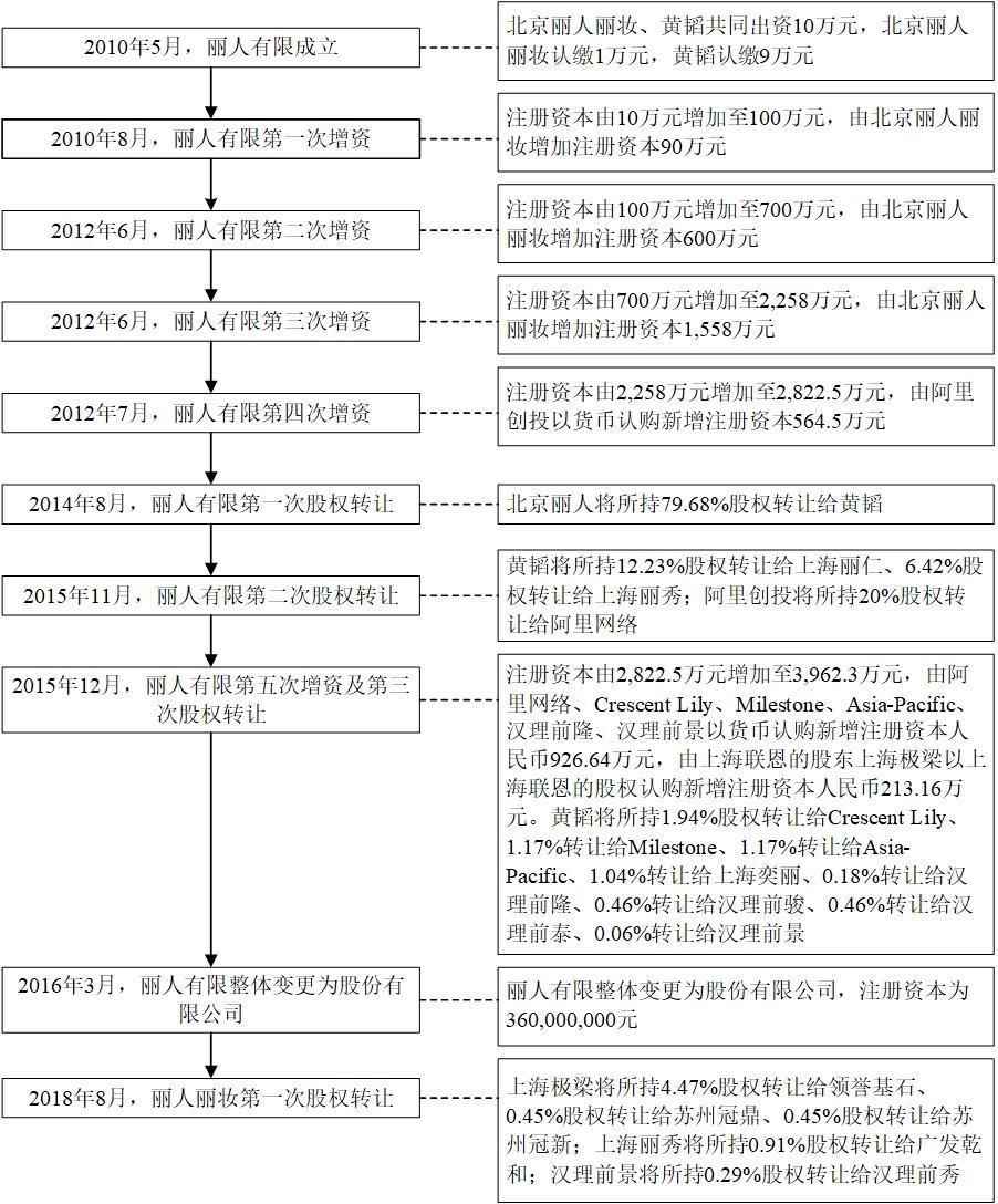 据丽人丽妆招股书,公司前身为上海丽人丽妆化妆品有限公司,成立于2010年5月27日,出资人为北京丽人丽妆化妆品有限公司(以下简称北京丽人丽妆)和黄韬,分别认缴了1万元和9万元。